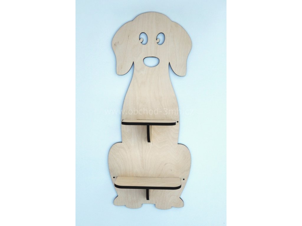 Dřevěná dětská polička s vyřezaným motivem psa rozveselí dětský pokojíček.