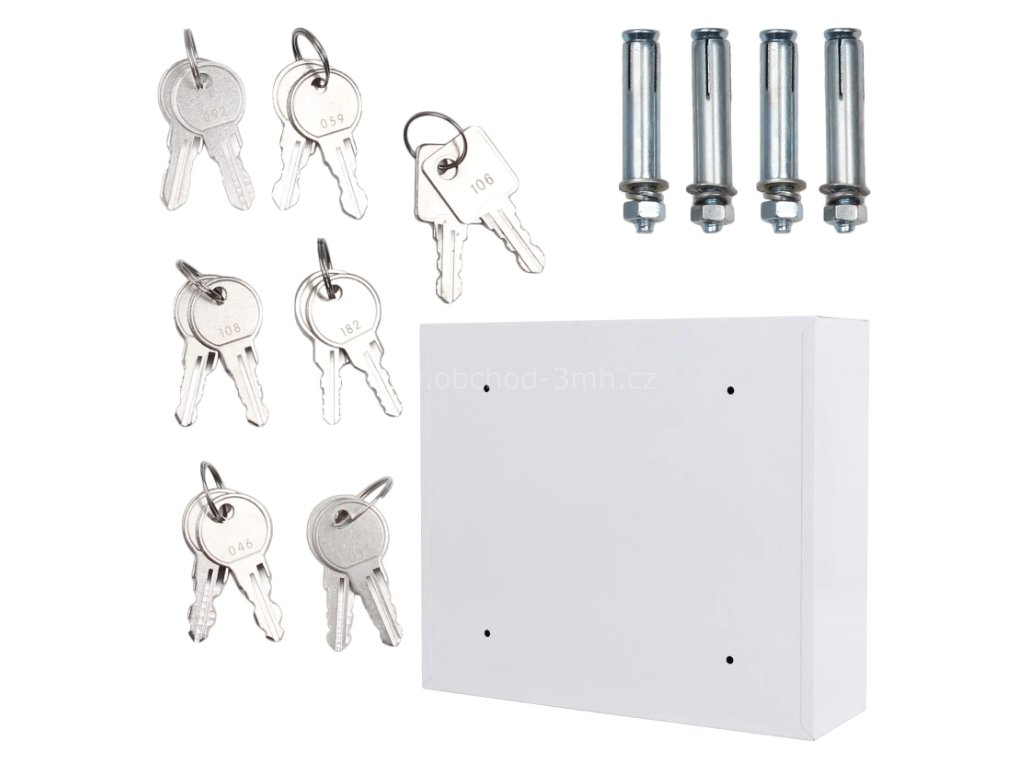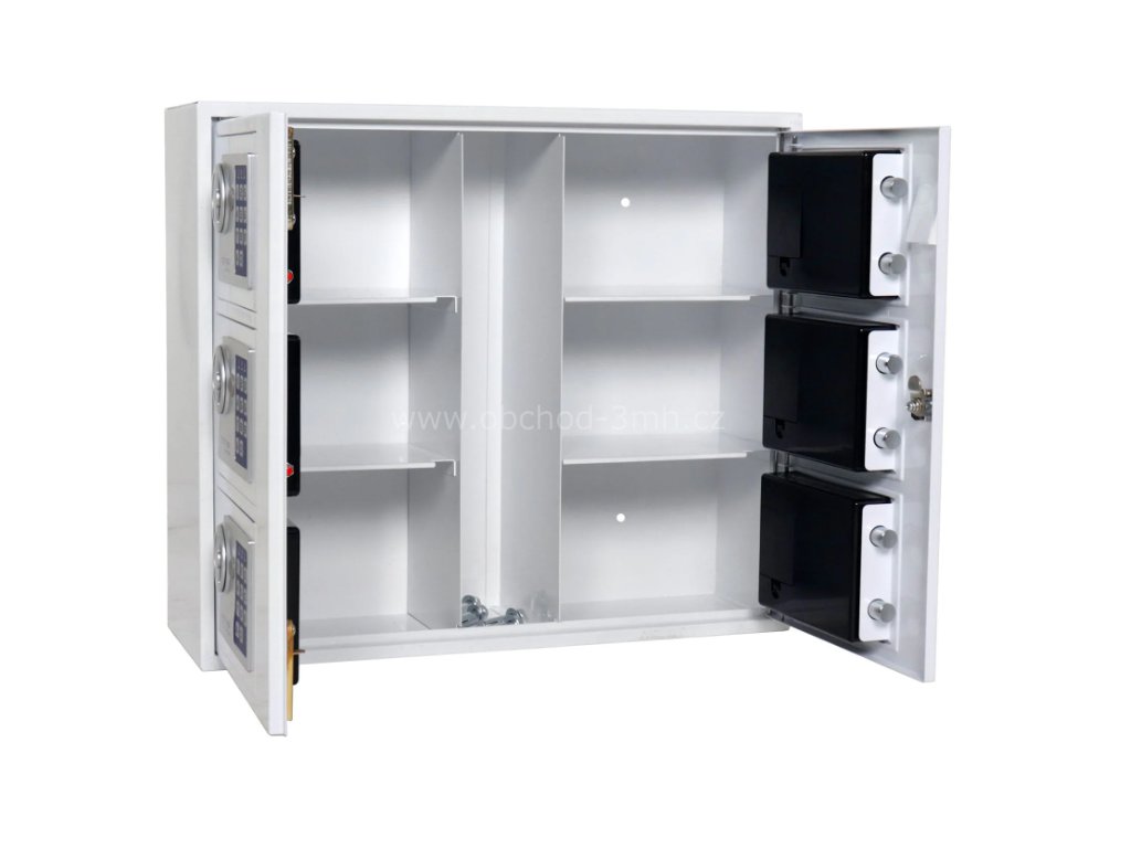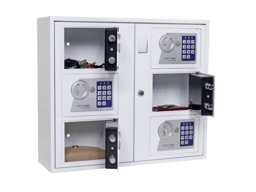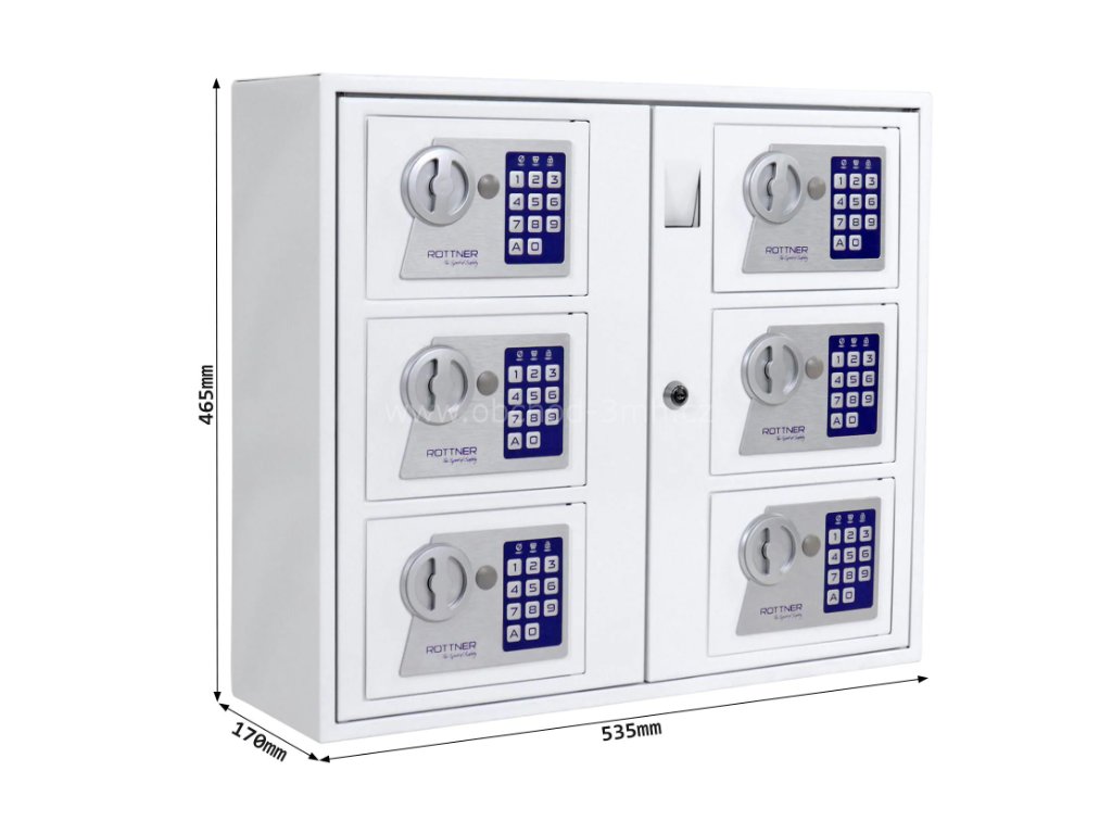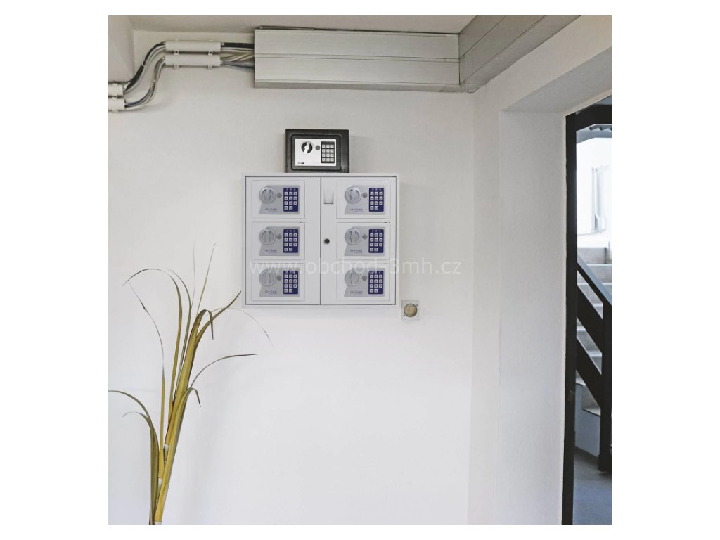 Představujeme unikátní řešení pro autosalony, autoškoly, garáže nebo velké obchodní místa jako uchovat hromadně klíče a menší věci. Systém, který má v sobě 6 samostatných sejfů je chráněn kvalitním elektronickým zámkem, a v případě potřeby je možné systém otevřít pomocí klíče. Pro každý sejf lze nastavit samostatný uživatelský kód (tzv. user kód) a zároveň mít i hlavní kód (tzv. master kód). Můžete tak jednotlivé sejfy zabezpečit pomocí 8-místních kódů. Napájení je řešeno samostatně pro každý sejf, přičemž na jeden sejf jsou nutné 4 x 1,5V AA baterie. Dohromady tak budete potřebovat 24 baterií. V pravém rohu nahoře je samostatný vhozový otvor pro klíče. Celý systém je možné připevnit pomocí otvorů na zadní straně. Upevňovací materiál je součástí dodávky.