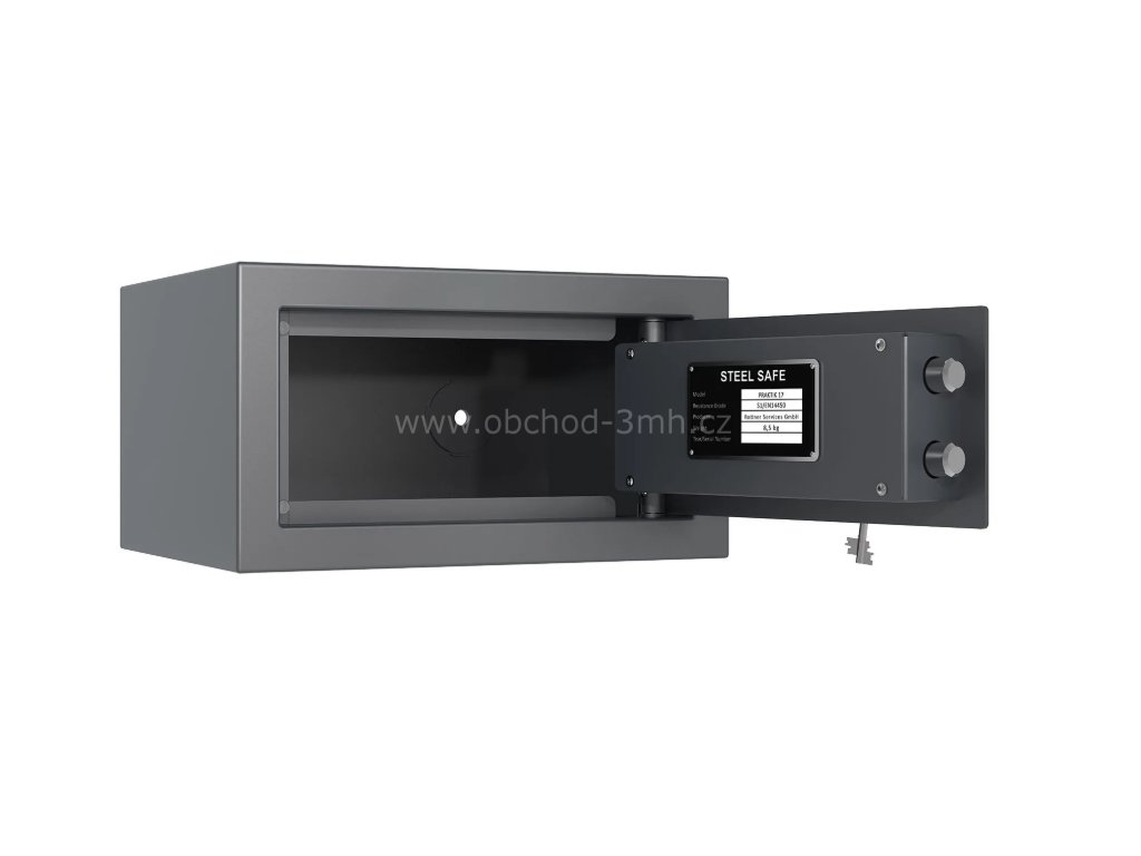 Jednoplášťový nábytkový trezor Praktik 17 nabízí dostatek prostoru pro důležité doklady, úřední dokumenty nebo cestovní doklady. Certifikovaný zámek třídy A (ČSN EN 1300) a bezpečnostní třída S1 (ČSN EN 14450+A1:2024) zajistí, že k uloženým věcem budete mít přístup pouze vy. Splňuje podmínku minimálně 15 RU podle normy ČSN EN 1143-1:2020. V trezoru je možné uložit také zbraně nebo střelivo. Trezor lze jednoduše ukotvit pomocí dvou otvorů v zadní nebo spodní stěně za použití přiloženého kotvicího materiálu.
