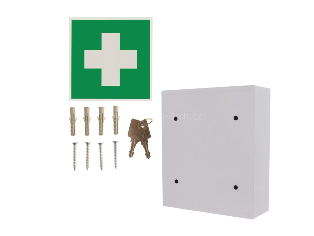 Udržujte si přehled a pořádek ve zdravotnických prostředcích pro rychlou pomoc. Nástěnná lékárnička s poličkou uvnitř umožňuje mít potřebné vybavení vždy po ruce pro každý případ. Lékárnička se dodává v kvalitním ocelovém provedení spolu s 2 klíči. Lékárnička se dodává prázdná, bez zdravotnického vybavení. Lékárničku jednoduše připevníte na stěnu pomocí připravených otvorů na zadní straně. Kotvící materiál je součástí dodávky.