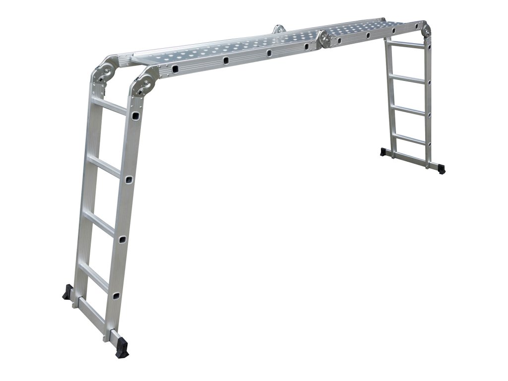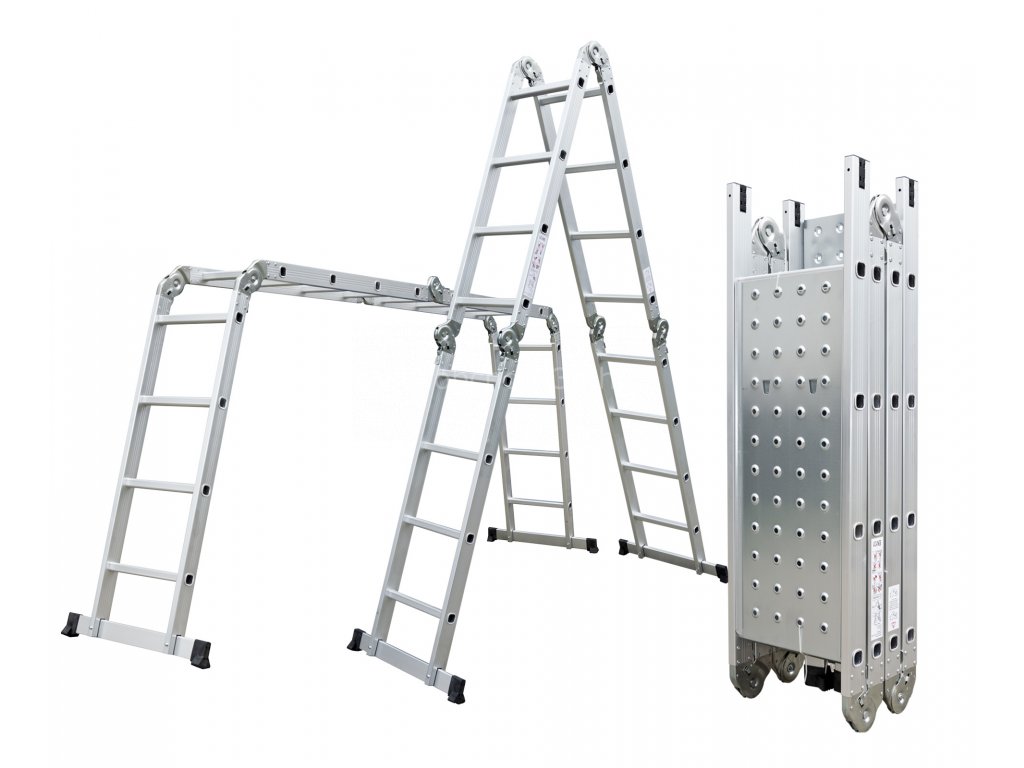 Hliníkové štafle můžete využít jednak jako dlouhý žebřík v délce až 4,6 m. Další variantou je možnost sestavit štafle jako přenosné lešení. Balení obsahuje 2 ks podlážek pro přestavbu štaflí na lešení. Díky konstrukci s klouby lze štafle snadno umístit přes hřeben střechy.